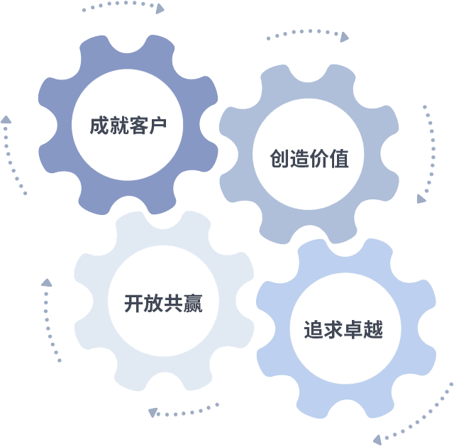成就客户是一切决策的出发点,,,创造价值是衡量所有工作的标准,,,,追求卓越是我们做事做人的态度,,开放共赢是我们的格局也是最终的结果。。。价值观的齿轮环环相扣,,,,推动着组织里的每个人不断向前。。