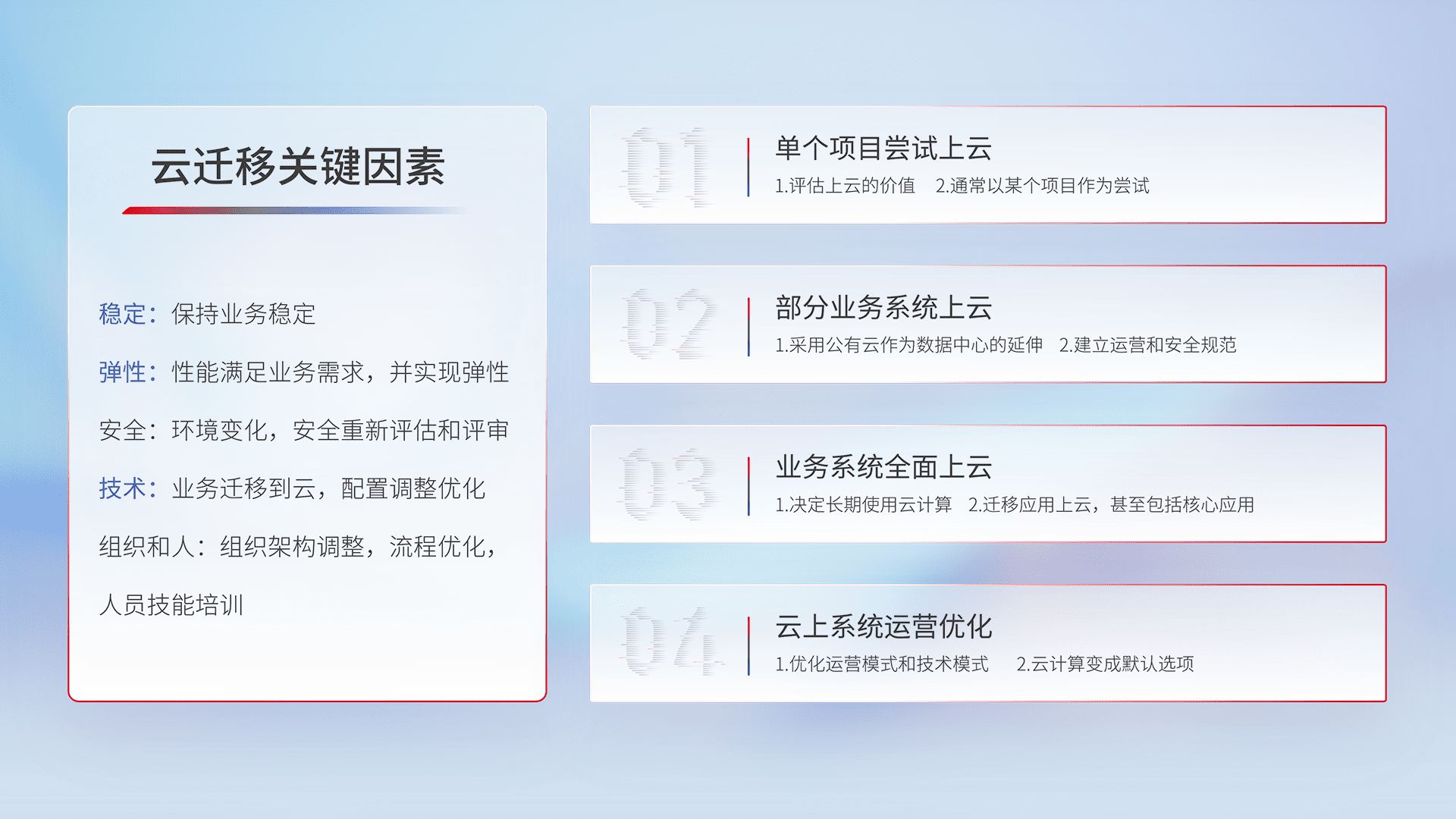 结合实际业务,,,,从规划设计、、云平台选型、、云原生改造、、、数据迁移、、、集成交付,,,,迁移全过程为客户识别最佳上云路径,,,做好风险识别管理,,,设计网络架构、、、身份权限、、、安全审计合规、、操作审计、、、、日志审计、、监控告警策略、、、多站点容灾设计等,,,,对云上基础设施进行整体规划,,,提升IT治理水平,,,,以满足弹性、、、、高可用、、、高性能的需求。。。。