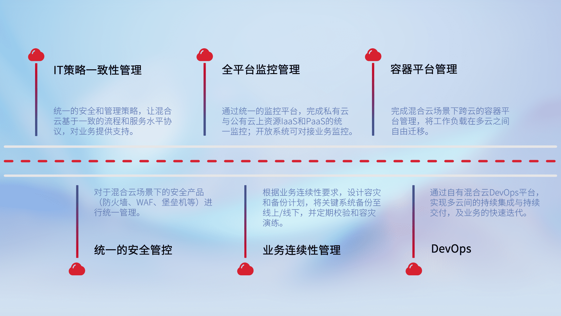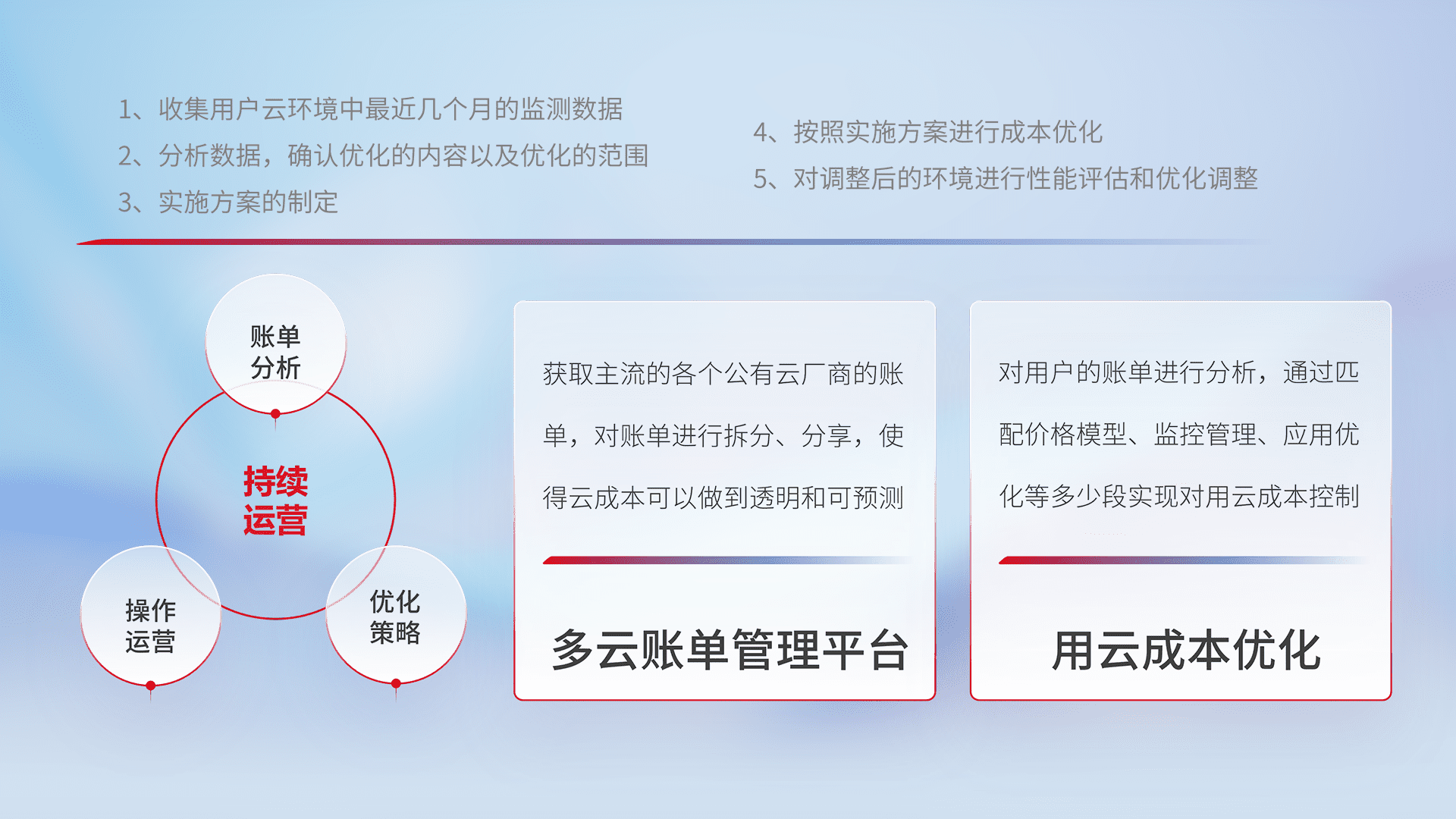 通过多云纳管,,以统一的资源数据模型把客户的云资源进行抽象和封装,,,进而实现对多云资源的统一操作,,,保障云资源管理的可靠性、、、稳定性与可用性。。量身定制化运维内容,,配置、、开发运维、、、、补丁管理、、备份、、、、监控、、认证和访问管理、、、、审计和日常巡检等,,,,保障在用云过程中的可靠度,,,,稳定度以及高可用率。。