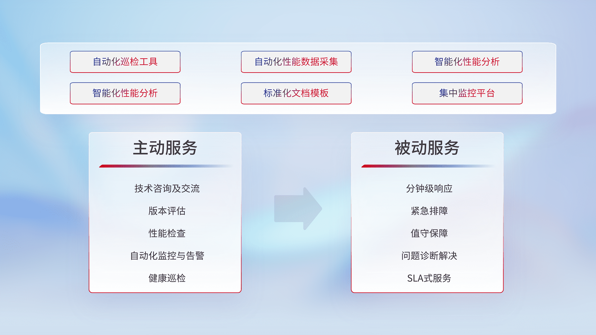智能化工具和标准化文档,,保障服务质量,,提供主动服务(包含技术咨询、、、版本评估、、性能检查、、自动化监控与告警、、、健康巡检)和被动服务包含(分钟级响应、、、、紧急排障、、、、值守保障、、、问题诊断解决、、、、SLA服务)。。。