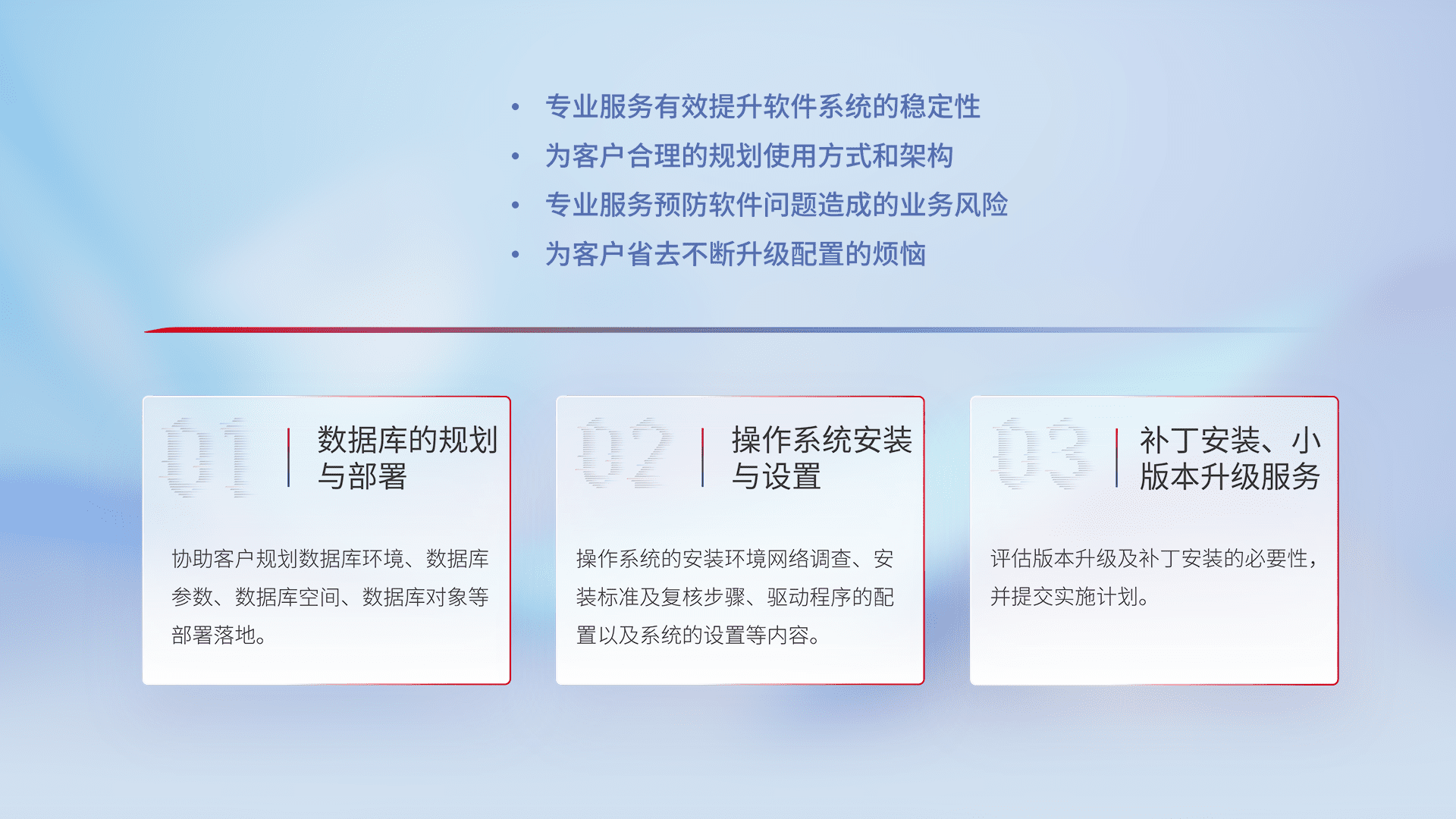 为客户提供软件规模升级、、、、快速部署、、按需配置的专业服务,,从数据库的规划与部署到操作系统的安装与设置,,再到补丁安装和小版本升级提供支持。。