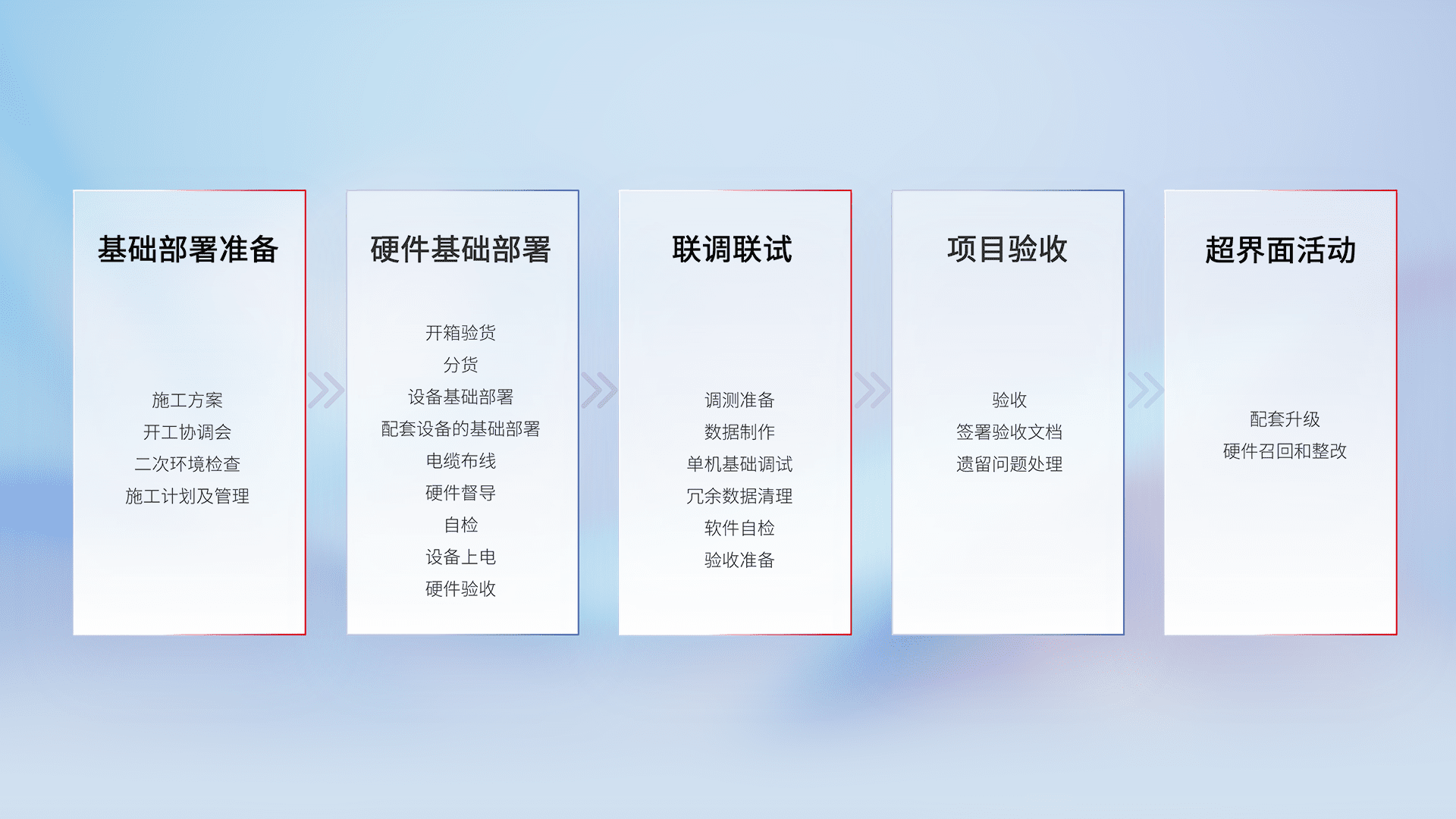 从基础部署准备、、硬件基础部署、、、联调联试、、项目验收、、、、越界面活动的全过程可追溯,,,,保证施工质量和进度。。。。